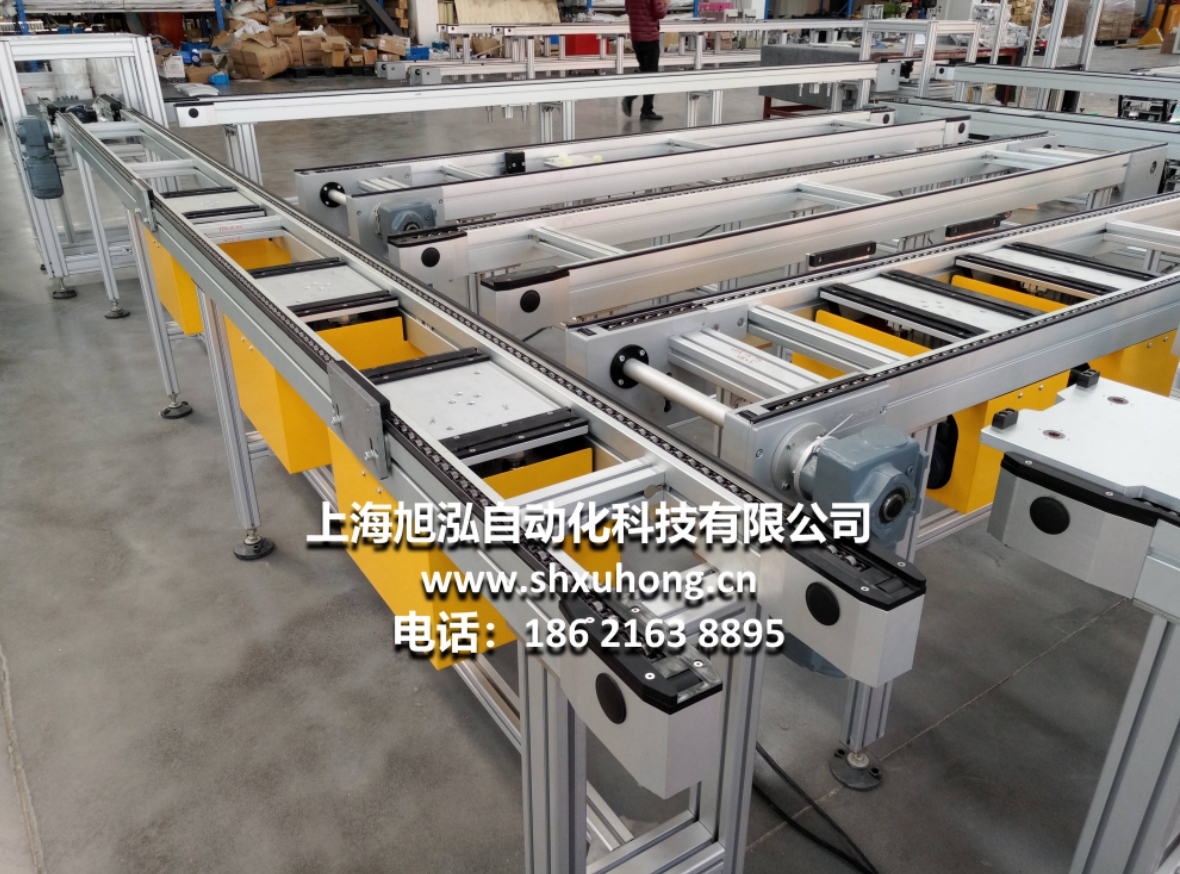 倍速链式生产线组成的生产线通常称为:自流式输送系统倍速链输送机,主要用于装配及加工生产线中的物料输送,其输送原理是运用倍速链条的增速功能,使其上承托货物的工装板快速运行,通过阻挡器停止于相应的操作位置;或通过相应指令来完成积放动作及移行、转位、专线等功能。